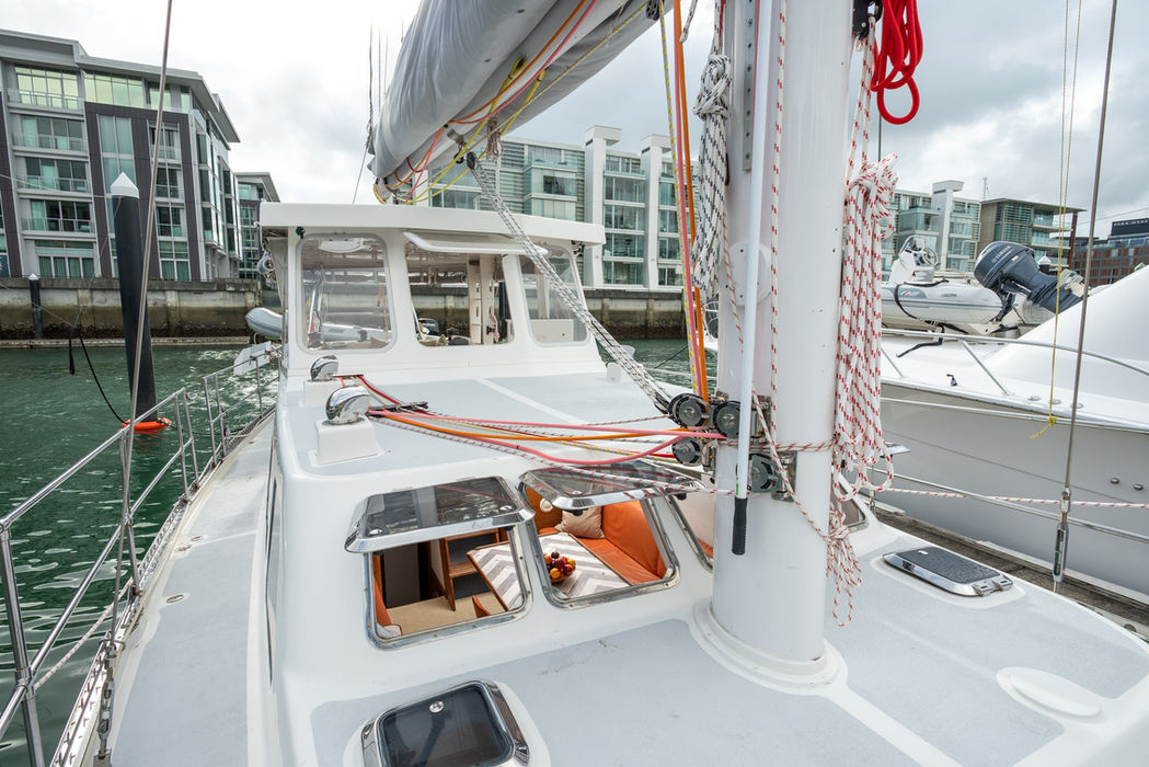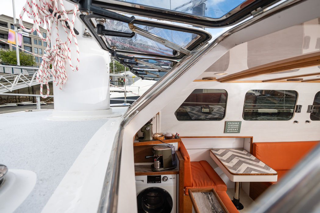 SEAMER offers a compelling blend of high-latitude capability and tropical cruising comfort. The elevated centre cockpit, complete with a hard dodger, gas-strut-assisted opening hatch, and full hardtop, is a standout feature. It provides a protected, spacious social area capable of comfortably accommodating up to eight guests. In warmer climates, it offers excellent sun protection, while the full enclosure system shields against weather and insects. The port-side command console, equipped with a modern B&G electronics suite and dedicated helm seating, allows for safe and comfortable operation in challenging conditions. All sail handling systems are led aft to the cockpit, enabling efficient short-handed sailing without the need to leave the helm.